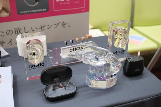 3月24日に発売となった、全く新しいスタイルカテゴリーの先進補聴器「オーティコン ジール」を展示しました。皆さんの補聴器へのイメージや概念を覆す製品として、老舗補聴器メーカーのオーティコンが約7年かけて開発した製品です。小さなボディにほしい機能が凝縮されており、Bluetooth(R)接続はもちろん、次世代ワイヤレス通信規格 Auracast(TM)(オーラキャスト)に対応しています。
