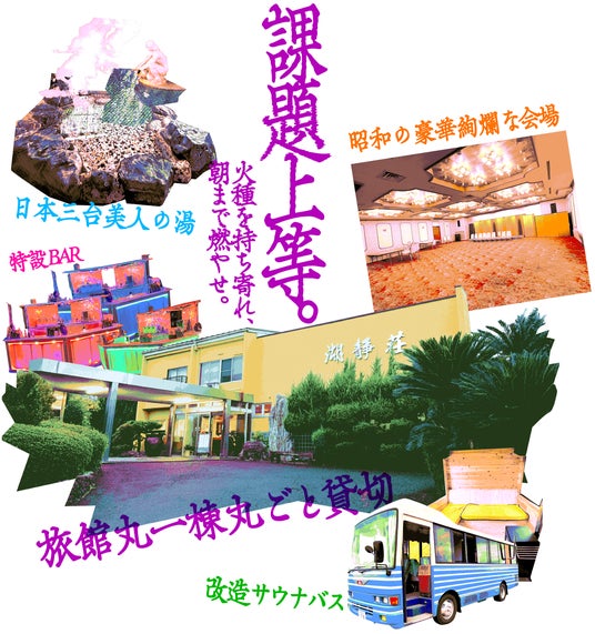 本イベントは、地方と都市、若者とベテラン、経営者とクリエイターなど、多様な人たちが課題や問いを持ち寄り、温泉宿を舞台に朝まで語り合う共創イベントです。登壇者の話を一方向に聞いて終わるイベントではなく、日本三美人の湯として知られる温泉、特別設置のサウナバス、ネオンや酒場の空気をまとった“小さなスナック街”のような対話空間のなかで、本音の対話と新たな火種が生まれる一夜をつくります。