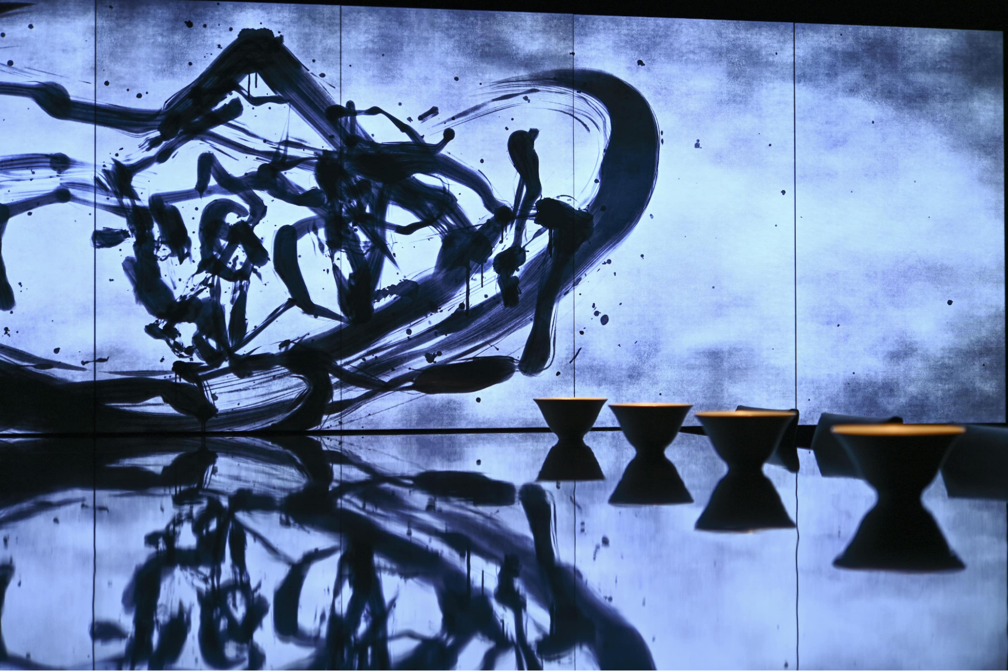 Vegan Ramen UZUの理念「地球に優しい食」チームラボの哲学「自然と人、人と人のつながり」をテーマにしたアート空間が食と融合する。墨書が壁と黒いテーブルに左右反転するデジタルアートは自然と食の調和、森羅万象に通ずる。同じ食卓で食事をすることも、人類の共存共栄のようでもある。