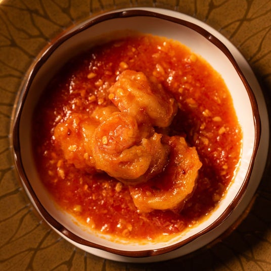 Poisson.I|大海老のチリソース炒めTHE CONDER HOUSEに来店したら必ず頼む一品。プリッとした食感の大ぶりのエビを使用しており、辛味の決め手には、いつものエビチリとは少し違い、乳酸発酵させた唐辛子「泡辣椒(パオラージャオ)」と、お米の発酵調味料である甘酒のようなテイストの「雪花醸(チュウニャン)を隠し味に加えることで、全てのお客様に親しまれる味わいに。