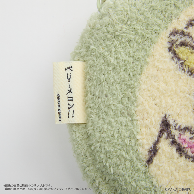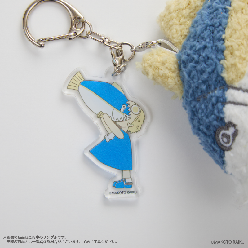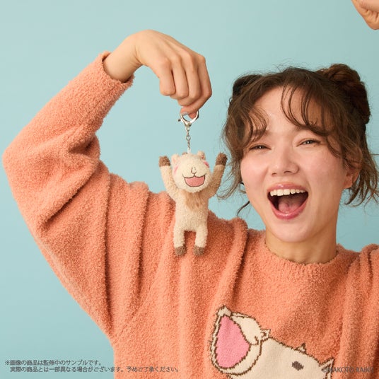 ふかもこ素材のやさしい触り心地に、キャラクターの等身イラストを使用したアクリルチャームが揺れるデザインがポイント。