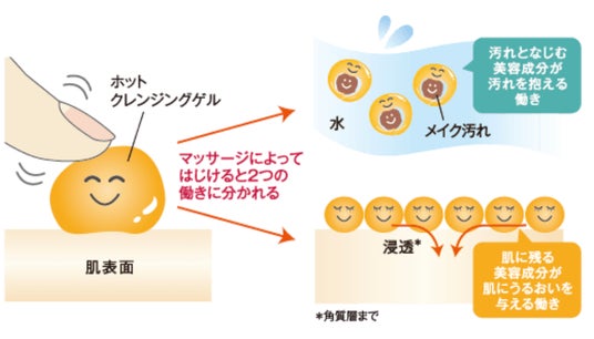 温感マッサージを施すことで血行がよくなった肌は、毛穴まわりの肌がゆるみ、美容成分が角質層まで浸透しやすい状態です。ホットクレンジングゲル マッサージプラスは、美容成分のバランスを変更 。 エイジングケア*¹のための成分をさらに追加 することで、若々しく、ふっくらツヤやかな肌へと導きます。