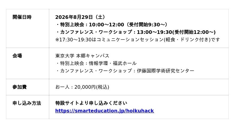 株式会社スマートエデュケーション(本社:東京都品川区、代表取締役社長:池谷 大吾)は、2026年8月29日(土)に2年ぶりとなるカンファレンス「Hoiku Hack2026(ホイクハック)」を東京大学 本郷キャンパス 伊藤国際学術研究センターで開催いたします。