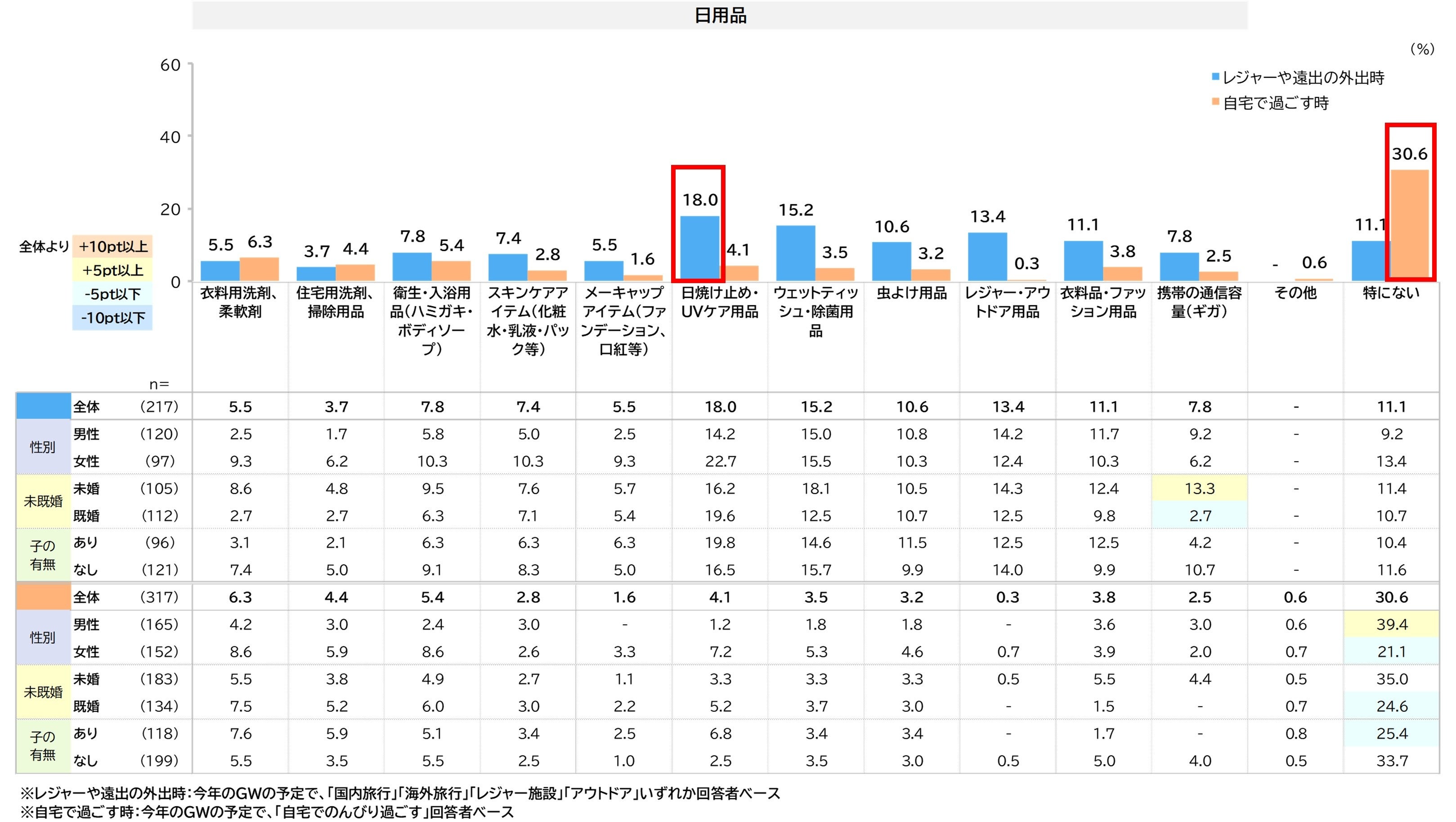 レジャーや外出時では「日焼け止め・UVケア用品」18%がトップです。自宅で過ごす時は、「特にない」が高くなっています。