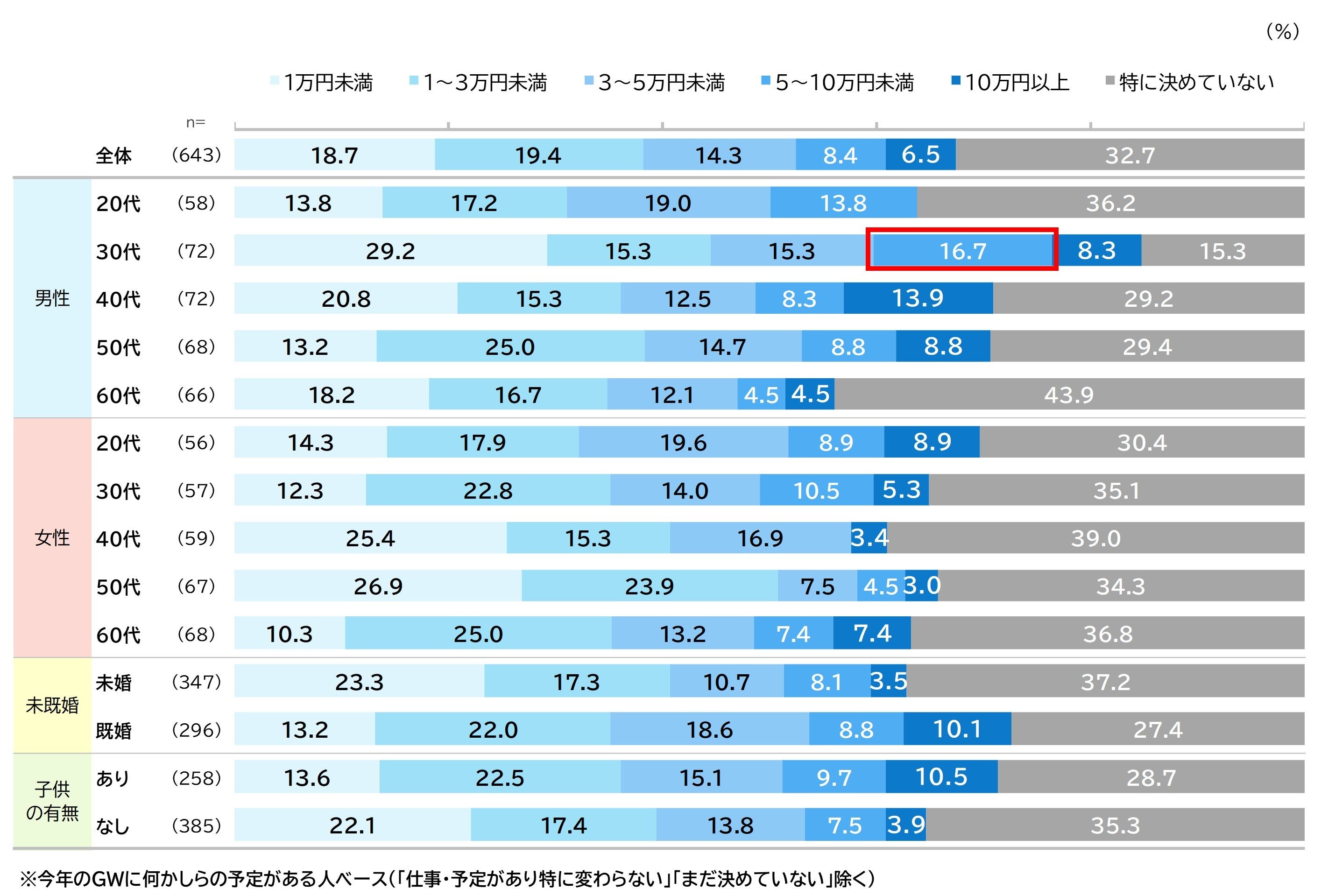 全体では「特に決めていない」が32.7%と最も高く、次いで「1~3万円未満」19.4%、「1万円未満」18.7%と続きます。男性30代では「5~10万円未満」が16.7%と他の世代より高くなっています。一方で「1万円未満」29.2%とこちらも他の世代より高くなっています。
