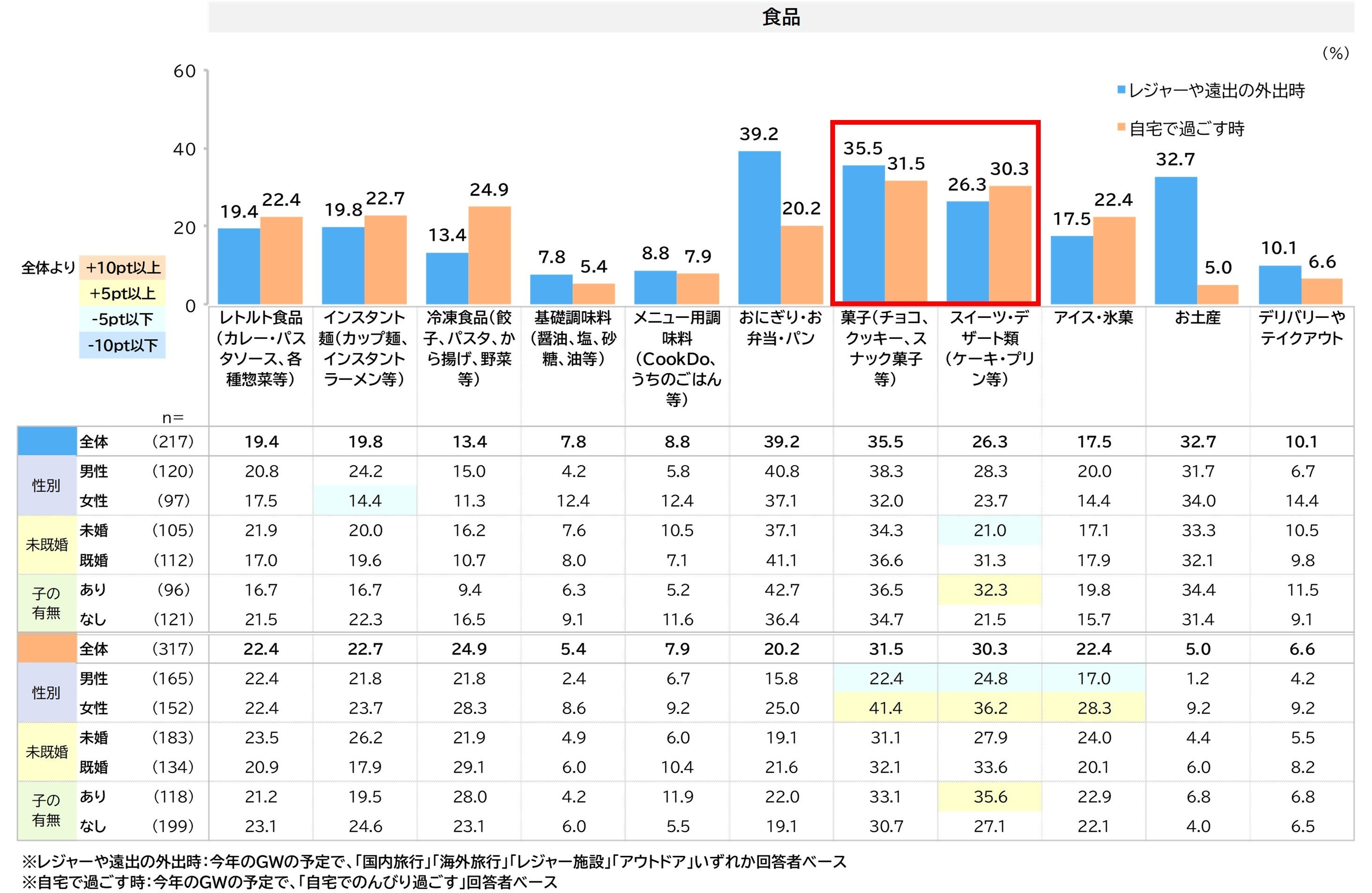 「菓子(チョコ、クッキー、スナック菓子など)」、「スイーツ・デザート類(ケーキ・プリンなど)」がレジャーや外出時、自宅で過ごす時ともに高くなっています。加えてレジャーでは「おにぎり・お弁当・パン」39.2%、「お土産」32.7%と高くなっています。