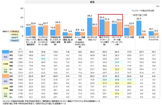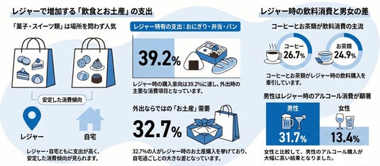 レジャー時にはコーヒー・お茶類、菓子・スイーツ、おにぎり・弁当・パン、お土産など“飲食とお土産”への支出が自宅で過ごすより消費の増加傾向が目立つ。