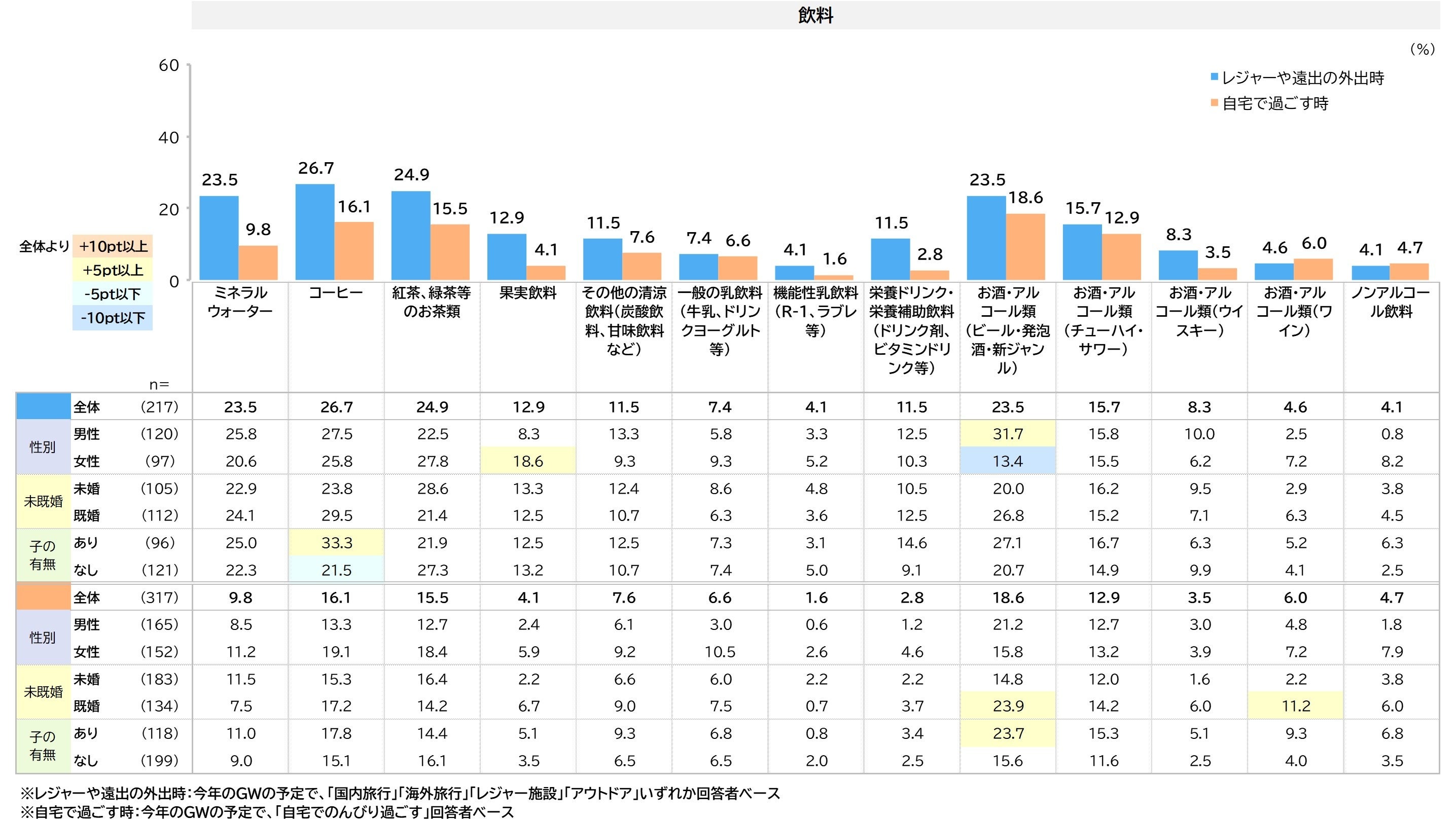 自宅で過ごす時より、レジャーや外出時のほうが、購入が全体的に増えています。レジャーでは「コーヒー」26.7%、「紅茶、緑茶などのお茶類」24.9%が高くなっています。「お酒・アルコール類(ビール・発泡酒・新ジャンル)」はレジャーで男性31.7%、女性13.4%と男性の方が高い傾向です。
