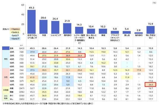 全体で、GWの予定が決まっていない人は29.1%、何かしら決まっている人が70.9%。GWの予定で最も多いのは「自宅でのんびり過ごす」で49.3%。男性30代は、国内旅行が 38.9% と全ての性・年代と比較して、最も高い。また、外食・ショッピング・レジャー施設利用の予定も他世代より高い傾向。それに伴い、支出では他世代よりも支出額が多く、支出が増えそうな項目で「交通費」が 47.2% と全体より高い。