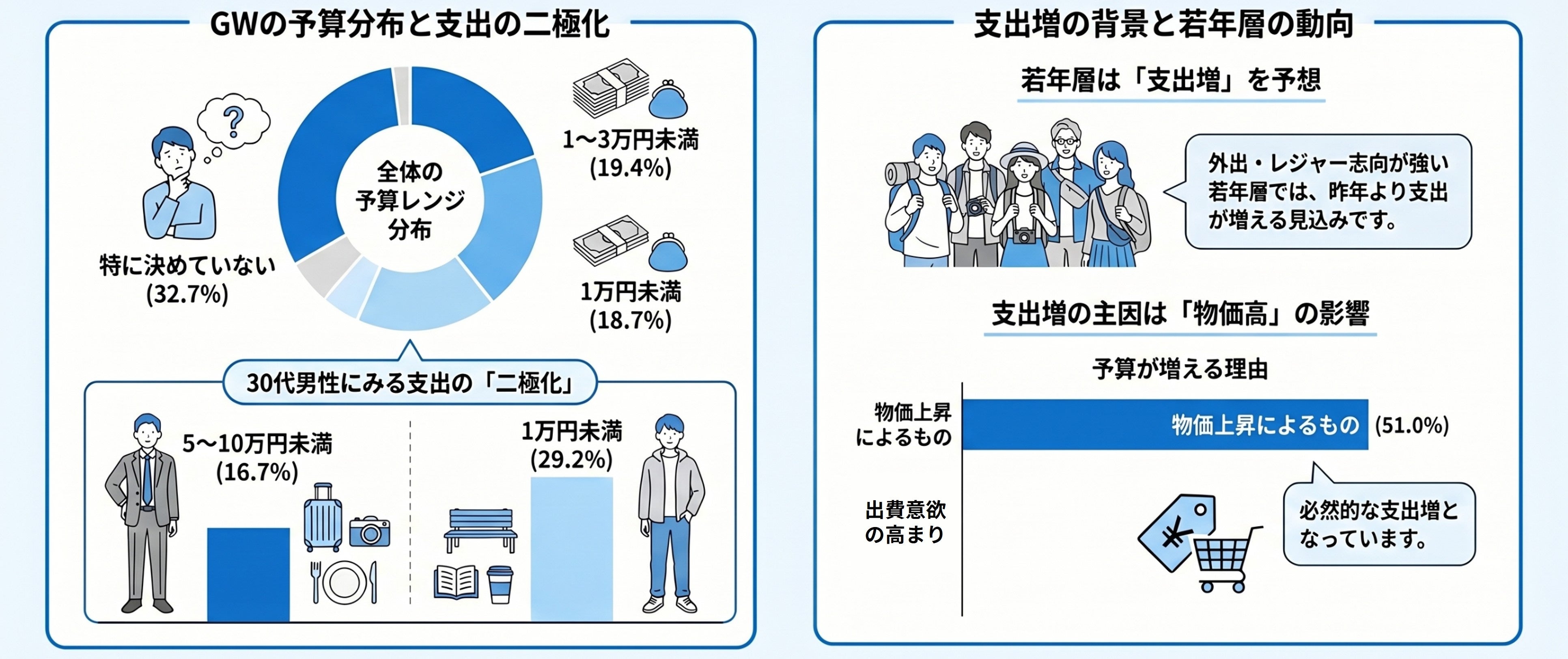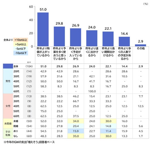 GWの支出については、使う金額は「決めていない」が最も高い一方で、「1万円未満」「1~3万円未満」の割合も高く、手頃なレンジに集中している。また、レジャー等の予定が多い若年層では昨年より支出が増える。ただ、支出増の背景は物価高の影響となっている。
