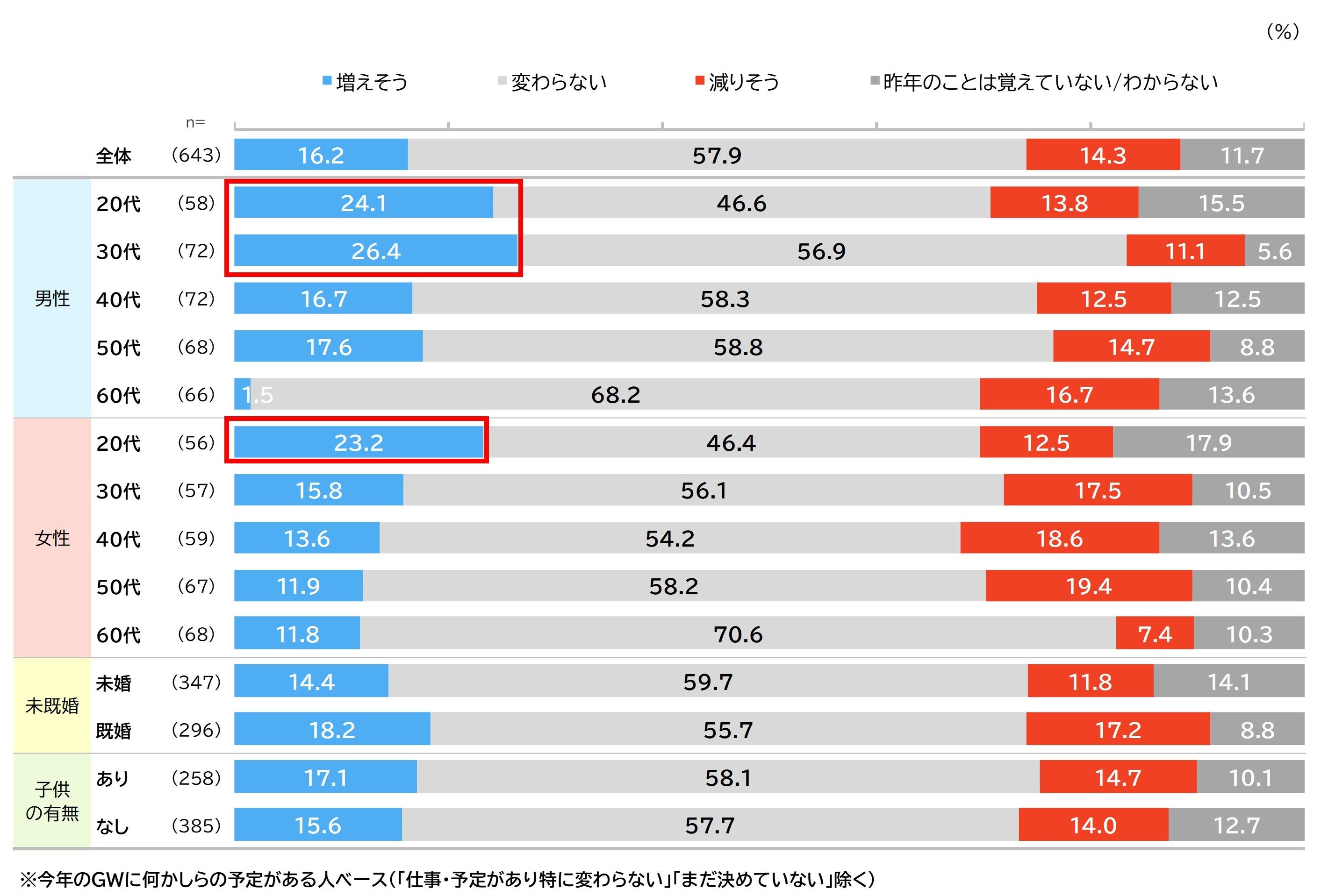 全体では「変わらない」が57.9%と最も多くなっています。「増えそう」16.2%と「減りそう」14.3%は同程度でした。男性20代、30代、女性20代で「増えそう」が「減りそう」より10pt以上高くなっていました。