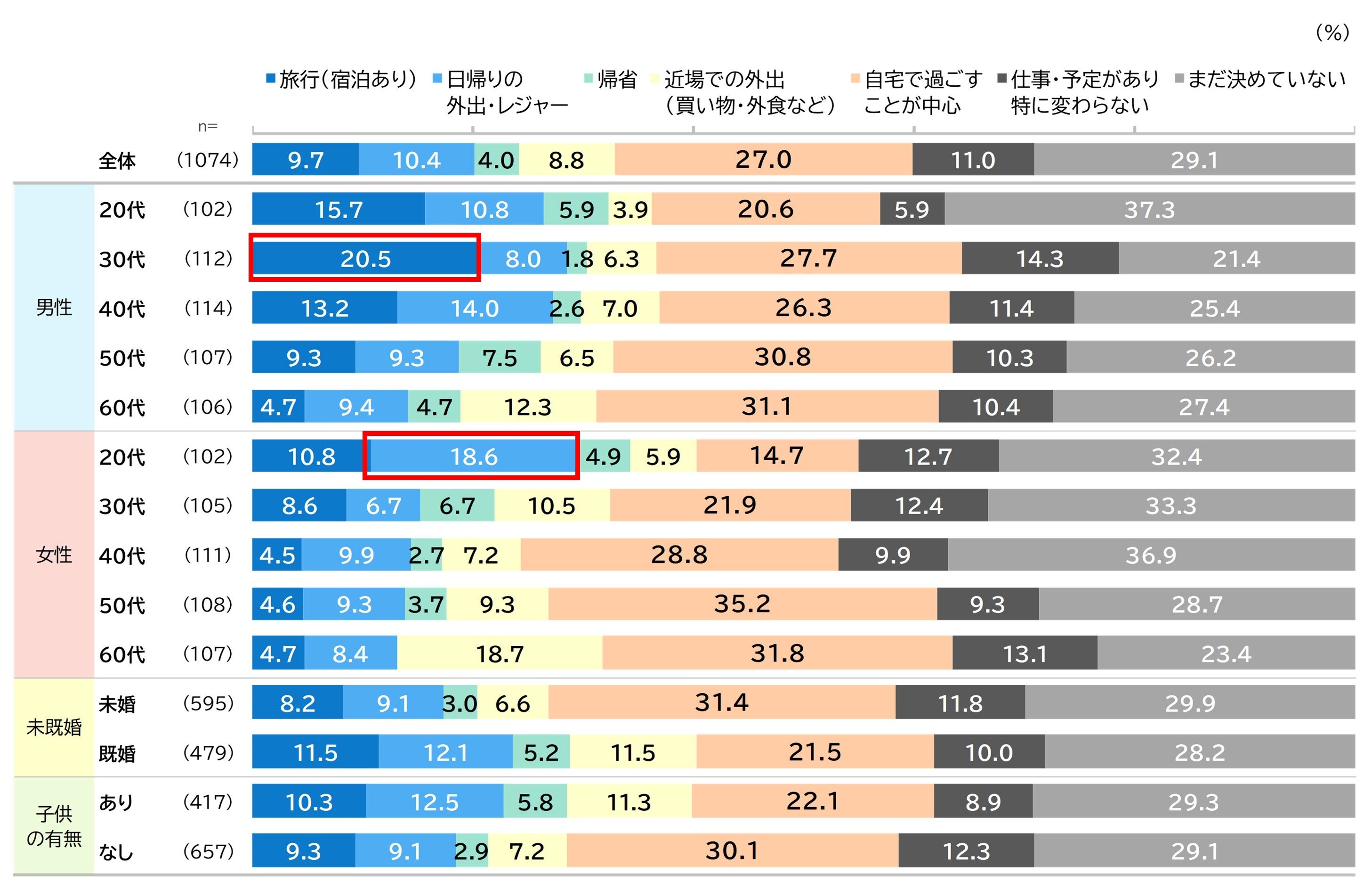 1.主なGWの過ごし方(単一回答)全体で「まだ決めていない」が29.1%と最も高く、次いで「自宅で過ごすことが中心」が27%と続きます。男性30代が「旅行(宿泊あり)」で20.5%とすべての性年代で突出しています。女性20代は「日帰りの外出・レジャー」が18.6%と最も高くなっています。