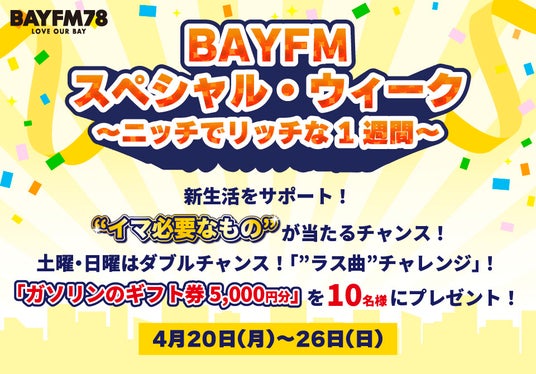 FMラジオ局BAYFM (78.0MHz)では、リスナーの皆さまの新しい門出を応援する特別企画「スペシャル・ウィーク ~ニッチでリッチな1週間~」を開催しています。リスナーが新生活に必要なものを募集。対象の生放送番組内で行われる「ガチャガチャ」で決定した金額(3,000円~30,000円)に合わせて、番組が実際にプレゼントを購入してお届けします。