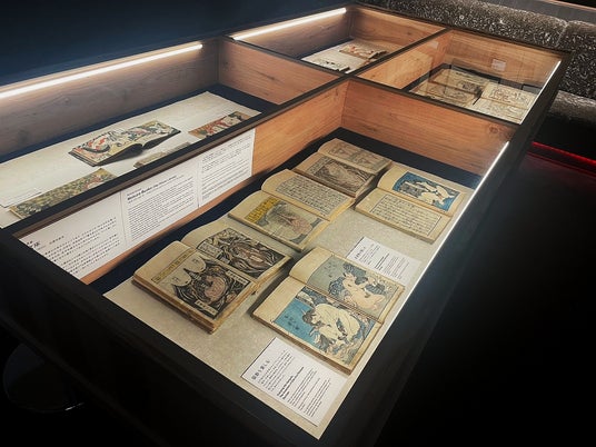 なお会場内では、さらに異なる『喜能会之故真通』を用い、上・中・下巻に収録された絵の全ページをめくる映像を放映しています。こちらもまた異なる表情をご覧いただけますので、ぜひ見比べてお楽しみください。