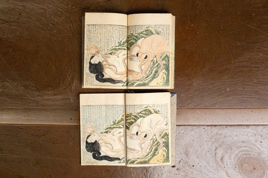 その1. 作品を後世へ―作品保護の取り組みとして、異なる版本の《蛸と海女》を特別公開葛飾北斎の艶本『喜能会之故真通(きのえのこまつ)』より、北斎の浮世絵春画の名作《蛸と海女》を期間限定(5月1日~5月10日)で特別公開します。