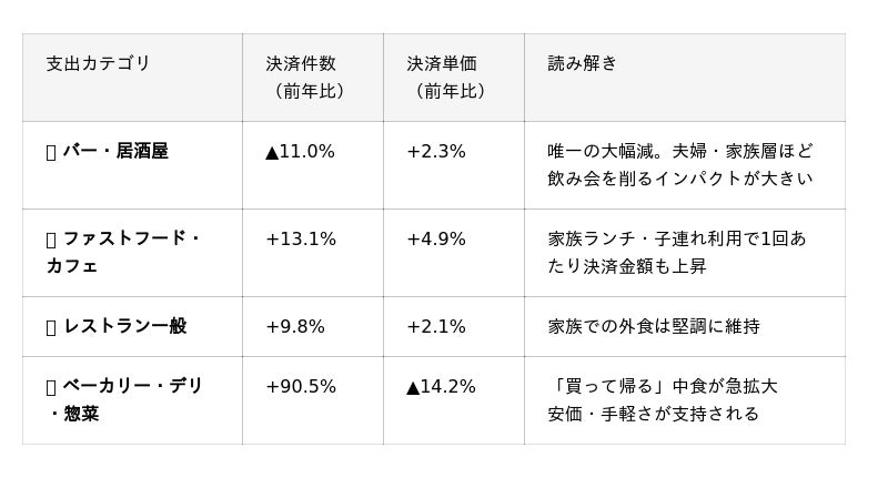 ■一方、「カフェ・ファストフード」の決済件数(月平均)は前年比+13.1%増。単価も+4.9%上昇し、家族ランチ・カフェデートなど「世帯単位でのプチ外食」が定着している様子