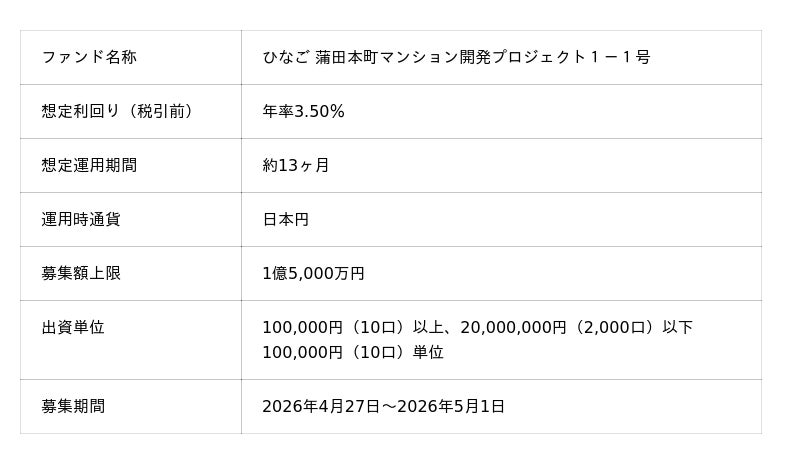 資産を「着実に」育てる「Funvest(ファンベスト)」(以下、Funvest)は、「ひなご 蒲田本町マンション開発プロジェクト1-1号」(以下、本ファンド)の募集を4/27より開始しますので、お知らせいたします。