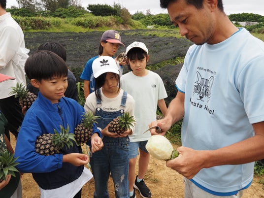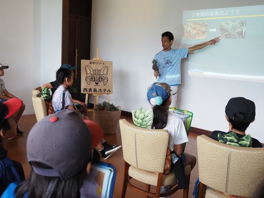 世界自然遺産に登録された西表島(いりおもてじま)で、日本初の「エコツーリズムリゾート」を目指す「西表島ホテル by 星野リゾート」では、2026年4月24日に、竹富町立上原小学校(以下、上原小学校)の4年生を招待し、「西表島ピーチパインの学校」を開催しました。地域のパイン農家、西表島トロピカルフルーツ生産組合の平井伯享(ひらいのりゆき)氏によるピーチパインについてのレクチャーや、収穫体験を通じて、地元の小学生へ西表島のピーチパインの美味しさを伝えました。このイベントを通して、島の子どもたちが、島の魅力を改めて知り、地元への誇りや愛情を深めました。