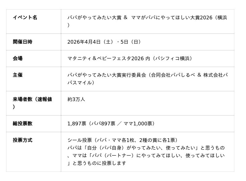合同会社パパしるべ(東京都品川区、代表社員:杉山錠士)と株式会社パパスマイル(東京都千代田区、代表取締役:永田哲也)が共同主催する「パパがやってみたい大賞 & ママがパパにやってほしい大賞2026」は、2026年4月4日(土)・5日(日)にパシフィコ横浜で開催された「マタニティ&ベビーフェスタ2026」(来場者速報値:3万人超)にて実施されました。