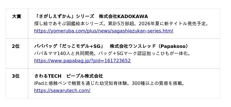 ★「完全制覇」(パパとママ双方の大賞を同一アイテムが獲得)は、2025年横浜(ビオレu)、2025年大阪(だっこモデル+SG)に続き史上3例目。「さがしえずかん」シリーズのKADOKAWAはエントリー常連ながら初戴冠での快挙となりました。