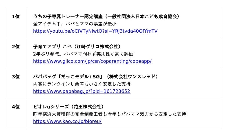 この企画ではパパとママが別々に投票するため、両者の関心度の差異が可視化されます。▼ パパの票がより多かったアイテム(上位)