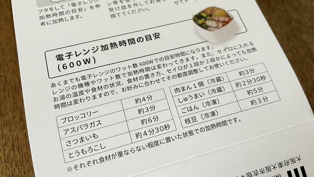 パッケージに電子レンジ600Wでの加熱時間の目安が書かれていますが、食材の組み合わせによって火の通りが変わります。