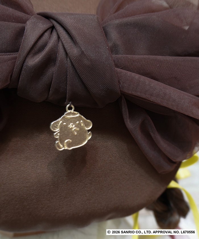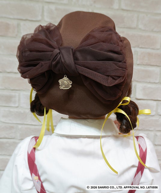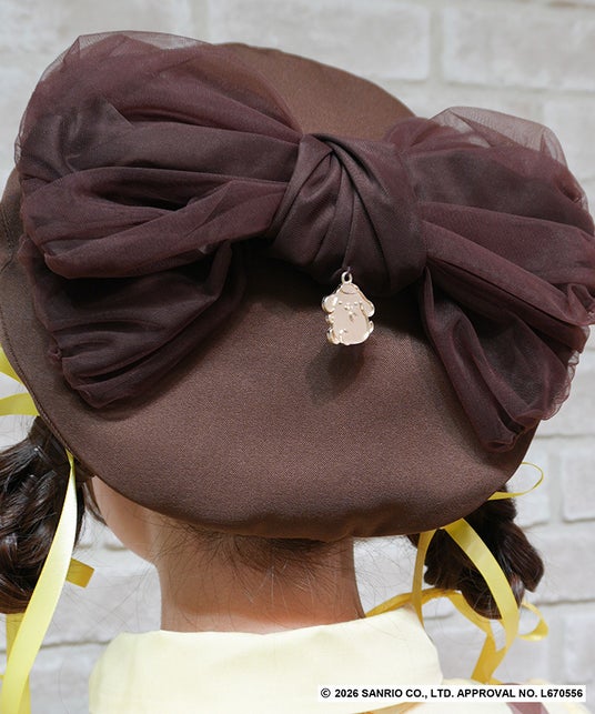 きらりと光るポムポムプリンのチャームをリボン下にあしらい、さりげなく世界観を楽しめるベレー帽。キャラクター性のあるブラウンカラーと大きなリボンがポイントです。