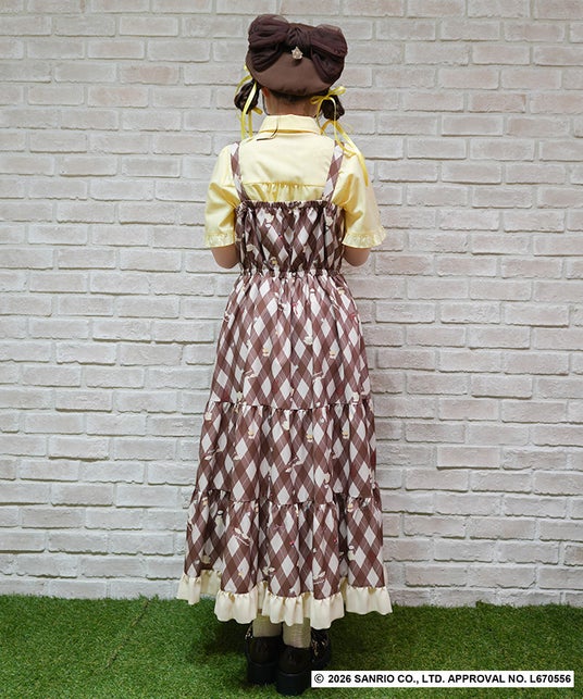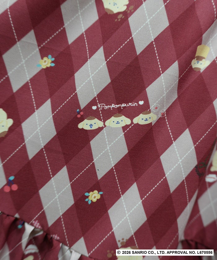 キュートにならんだポムポムプリンに癒される、axes femmeのロゴやクラシカルなチェック柄、やさしいお花モチーフをミックスしたレトロな印象を与えるオリジナルプリントを上身部分にあしらったワンピースです。胸元にはポムポムプリンの刺繍をほどこし、可愛らしい着こなしが叶うワンピース。