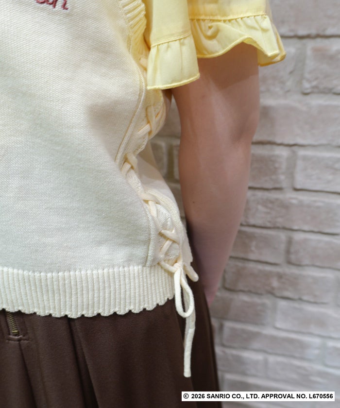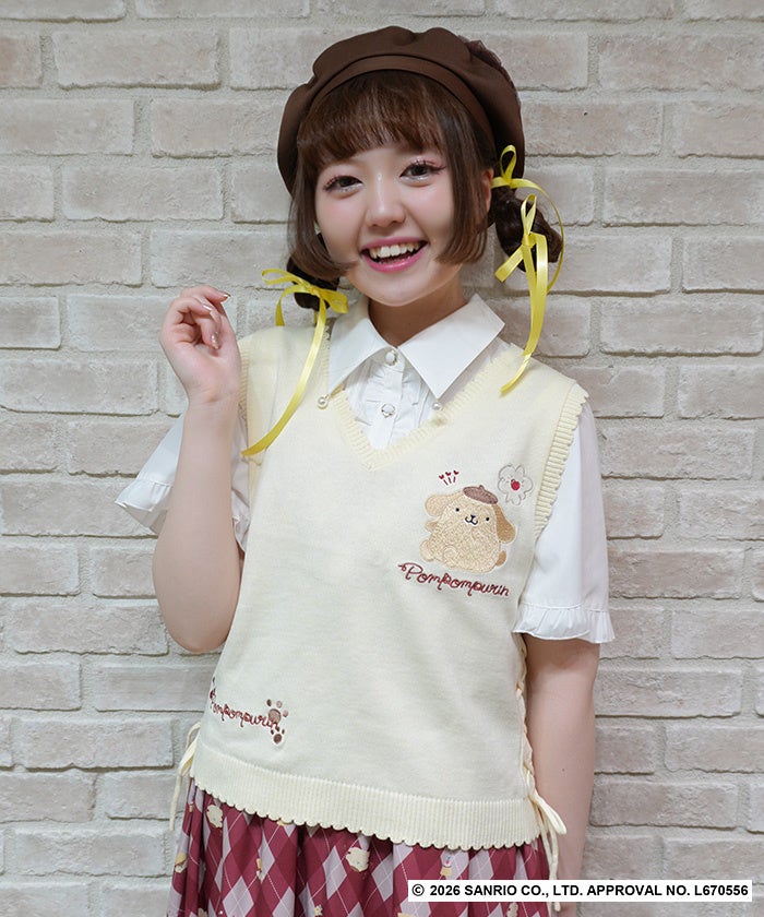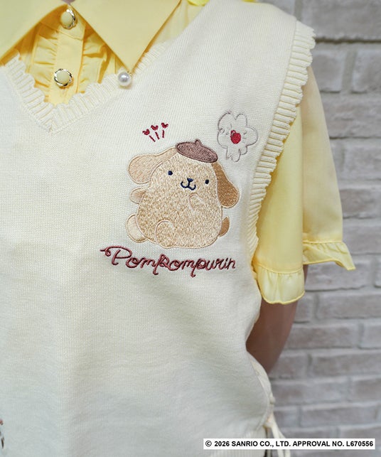 フロントには大きなポムポムプリンの刺繍をあしらい、存在感抜群なアイテム。手書き風のロゴやさくらんぼモチーフ、チャームポイントのしるしなどキャラクター性を散りばめたデザインです。柔らかく薄手の素材感でロングシーズン活躍するニットベストです。