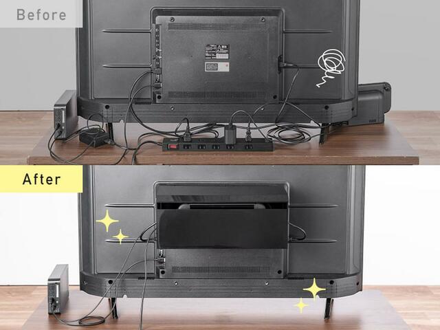 付属のボルトで写真のように取り付け、ごちゃつきがちな電源タップや長いケーブルを入れるだけ。デッドスペースを「浮かせて&隠してスッキリ収納」スペースに変身させられますよ。