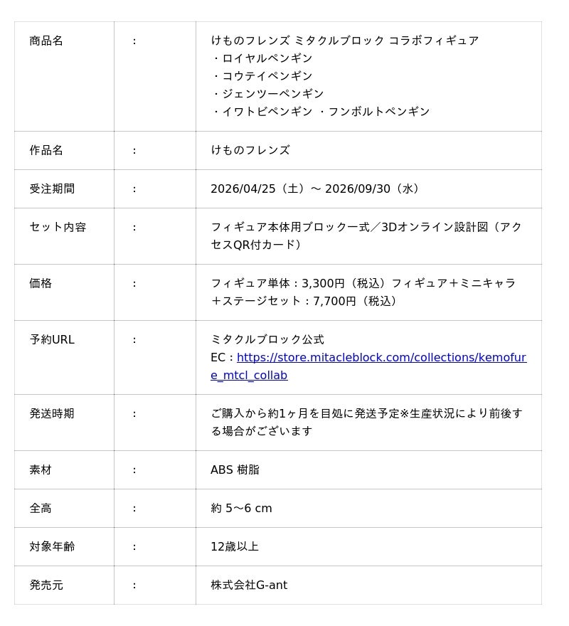 株式会G-ant(所在地:東京都中央区、代表取締役:平川 彰悟)は、けものフレンズプロジェクトとの年間コラボレーションを開始し、ボクセル技術を活用した組み立てフィギュア「ミタクルブロック」新商品の発売をお知らせいたします。第1弾は世界ペンギンの日(4月25日)に合わせ、「けものフレンズ」に登場する5人のペンギンフレンズをミタクルブロック化、本日ミタクルブロック公式ECサイトで受注生産で販売開始いたします。