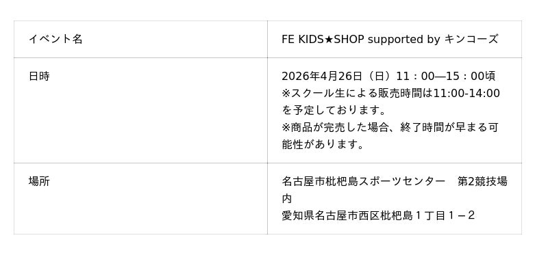 2026年4月26日(日)に行われるFE名古屋のホーム最終戦(長崎ヴェルカ戦)において、子どもたち自身が企画・デザインしたオリジナルグッズを販売する特別ブース「FE KIDS★SHOP supported by キンコーズ」を出店します。