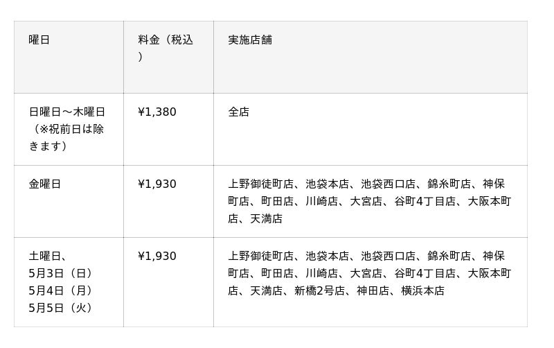 ・上野御徒町店、池袋本店、池袋西口店、錦糸町店、神保町店、町田店、川崎店、大宮店、谷町4丁目店、大阪本町店、天満店は¥1,930(税込)で金曜、土曜、祝前日も開催します