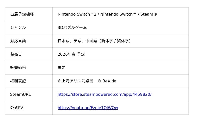 株式会社ビサイド(本社:東京都立川市、代表取締役社長:南治 一徳、以下ビサイド)は、新作ゲーム『東方ゆっくりマウンテン』を、Steam(R)(Windows/Mac)、Nintendo Switch(TM)、およびNintendo Switch(TM) 2 Editionにて2026年春にリリースすることをお知らせいたします。