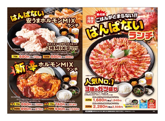 焼肉レストラン 安楽亭(所在地:埼玉県さいたま市)は、2026年4月23日より、40店舗限定販売の「はんぱないランチ」をリニューアルいたします。