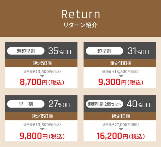 割引率40%の2個セット(10名限定)・35%の超超早割(50名限定)など、Makuake限定のリターンを用意しています。