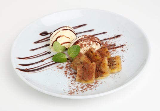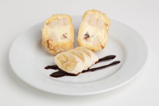 当店名物のアイスクリーム天ぷら。今回は甘熟王バナナを練り込んだアイスクリームで作りました。相性抜群のチョコレートソースと、スライスバナナも一緒に楽しんでいただけるデザートです。