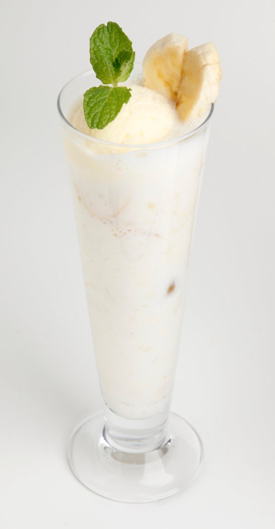 ドリンクに、バニラアイスとスライスバナナをのせました。デザートのように楽しめる、バナナラッシーです。