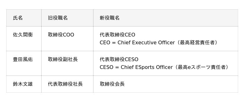 その実現のため、佐久間のビジネス・テクノロジー経験、豊田の競技シーン・教育事業への情熱、鈴木のeスポーツ業界への愛と信頼、これらを結集する最適な経営体制へ変更いたします。