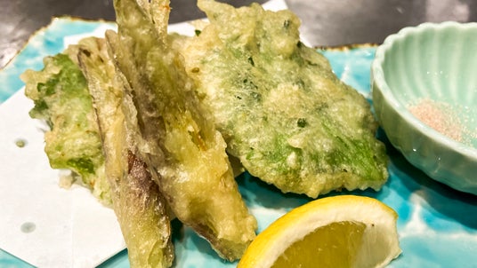 天ぷら二種盛り(大葉あじさんが天&茗荷天):799円(税込878円) サクッと香ばしい初夏の香り。