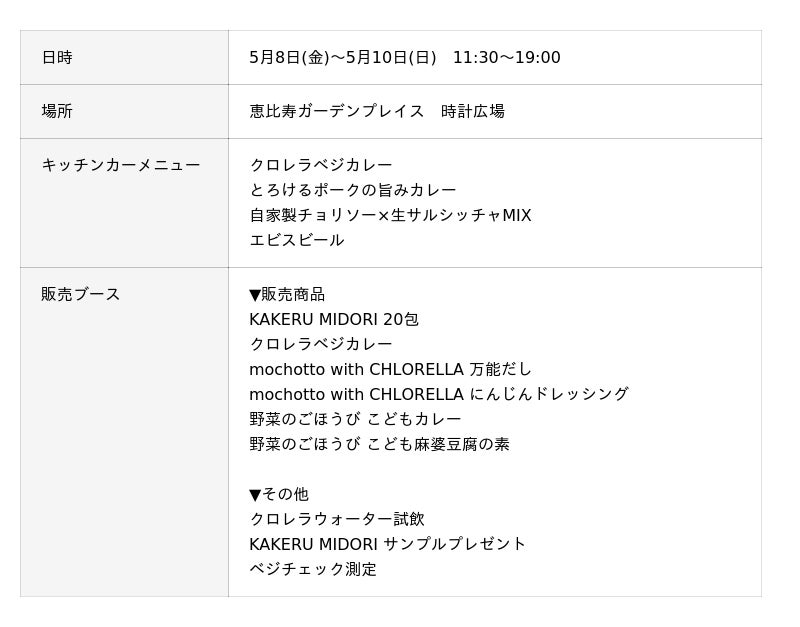 クロレラ工業株式会社(本社:福岡県筑後市、代表取締役社長:板波 英一郎)は、5/8(金)~5/10(日)に恵比寿ガーデンプレイスにて開催される『EBISU Bloomin’ JAZZ GARDEN 2026』に出展し、キッチンカーでのクロレラベジカカレーの提供や販売ブースでの筑後産クロレラ食品の販売を実施いたします。
