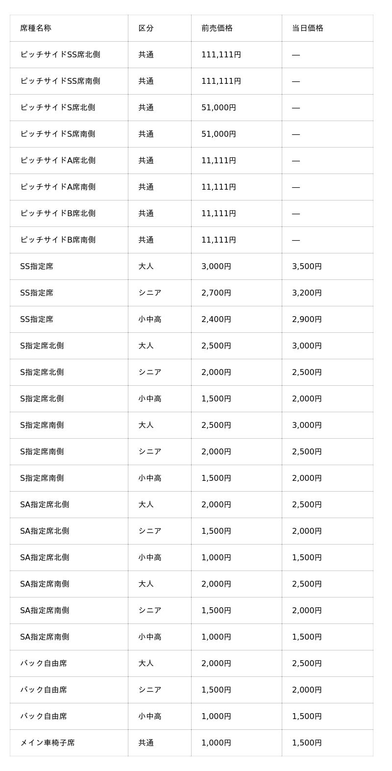 ピッチサイドSS席、S席の場合)ピッチ中央より順番に自動配席となります。 ピッチサイドA席、B席の場合)ゴールより順番に自動配席となります。