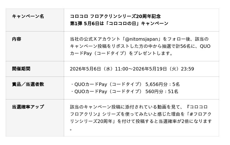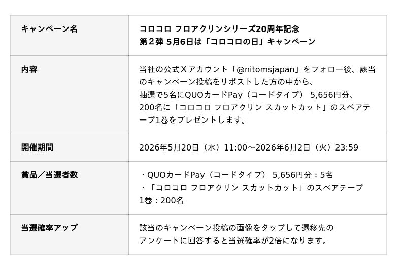 株式会社ニトムズ(本社:東京都品川区、代表取締役社長:石川純子)は、フローリングや畳などさまざまな床材に使用できる『コロコロ フロアクリン』シリーズ発売20周年を記念したキャンペーンを開催します。