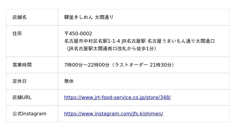 ジェイアール東海フードサービスが運営する、JR名古屋駅・名古屋うまいもん通りの「驛釜(えきかま)きしめん 太閤通り」「キッチンなごや 太閤通り」ではオリジナルコラボメニュー販売、「名古屋・驛麺(えきめん)通り」では東海道新幹線をご利用の上、店舗にて食事された方を対象にオリジナルステッカーの配布を実施します。