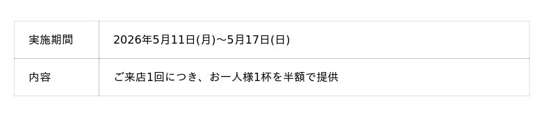 キリンシティ株式会社(本社:東京都中央区、代表取締役社長:田中 賢了)は、2026年5月11日(月)から5月17日(日)までの期間、ビアレストラン「キリンシティ」「キリンシティプラス」全27店舗にて、『キリンシティ創業43周年祭「ブラウマイスター」または「達人ブレンド」Regularサイズ おひとり様1杯半額』 を実施いたします。