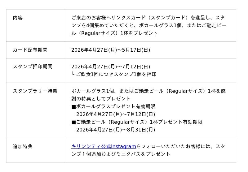 サンクスカードはスタンプカード仕様となっており、スタンプを4個集めていただくと、ポカールグラス1個、またはご馳走ビール(Regularサイズ)1杯を感謝の特典としてプレゼントいたします。