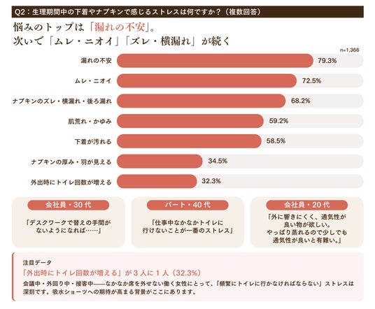 吸水ショーツへの期待や不安を聞く中で、家族や友人という近しい間柄でも、今さら聞けない「生理」の悩みが分かりました。今回は「働く女性」をクローズアップし、職場で「当たり前」となっている「生理ストレス」をまとめました。