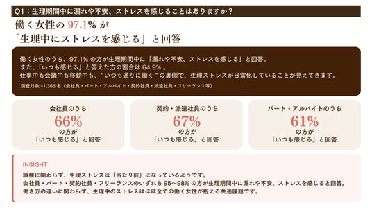 働く女性の97.1%が「生理ストレスを感じる」と回答。「漏れない」「ムレない」「ニオわない」全てを叶えるものを求めている。