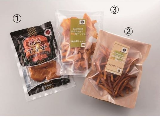 温度・湿度を徹底管理した貯蔵庫で安納芋を約1カ月熟成。砂糖不使用とは思えない濃厚な甘さ。【初登場】<中園ファーム>(1)熟成安納芋の焼き干し芋(丸干し)100g 756円(2)熟成安納芋の塩けんぴ 50g 594円(3)熟成安納芋の黄金塩チップス 50g 594円