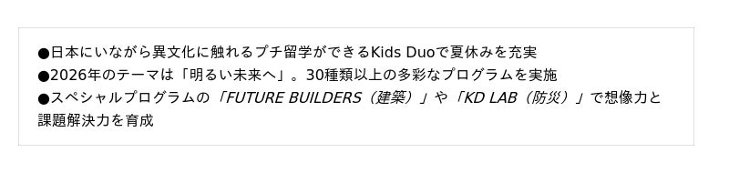 Kids Duoは、全国210以上のスクールネットワークと、これまで10万人以上の卒業生を送り出してきたノウハウを活かし、従来の安全にお子さまをお預かりするという学童保育の枠組みを越えて、お子さまが未知なる世界に触れ、新しい興味の扉を開く時間へと変えていきます。そして、サマースクールを通じて、単なる過ごし方のマンネリ化を防ぐだけでなく、英語というツールを使って多様な価値観や社会課題に触れる体験を提供し、子どもたちが本来持っている無限の好奇心と、未来を切り拓く主体性を最大限に引き出してまいります。